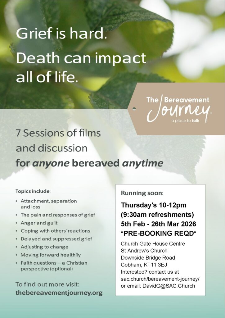 The Bereavement Journey is being offered by churches and Christian organisations across the UK and world. Ideally participants attend a programme in their local area. This page is for booking the programme offered by St Andrew’s. Cobham, and is open to people in that area. If you are based elsewhere, please visit the locations page on www.thebereavementjourney.org/locations before booking, to see whether there is a programme running nearer that would suit you. If there isn’t, please use the link at the top of the same page for the national online programme.